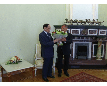 Event: Tatarstan President Rustam Minnikhanov congratulates people's artist of the Russian Federation and the Republic of Tatarstan, laureate of State Prize of the Republic of Tatarstan named after G.Tukai I.G.Shakirov on his 80th anniversary, handing over medal of the Republic of Tatarstan "For valorous labour" 14.02.2015