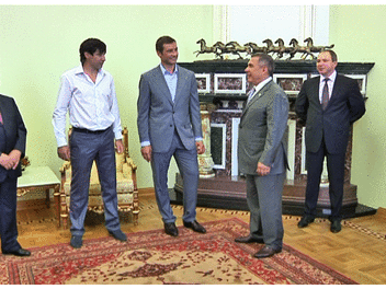 Event: Tatarstan President Rustam Minnikhanov presents Orders of Merit for the Republic of Tatarstan to former players of Ak Bars hockey club A.A.Morozov and D.Z.Zaripov 05.07.2013