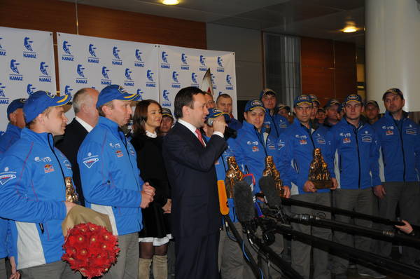Пресс-службаФоторепортажиТоржественная встреча команды "КАМАЗ-мастер", победителя авторалли "Дакар-2014" в классе большегрузных автомобилей. Принимает участие Премьер-министр Республики Татарстан И.Ш.Халиков.