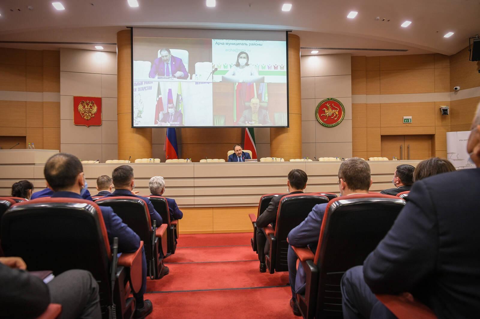Республиканское совещание в режиме видеоконференции по вопросам: 1. О реализации мероприятий по обеспечению развития экономики Республики Татарстан; 2. О реализации республиканских программ жилищного строительства и строительства объектов социального назначения, программ по благоустройству общественных зон; 3. О ходе реализации республиканской программы «Наш двор»; 4. О дорожных работах в муниципальных образованиях Республики Татарстан; 5. О реализации Министерством экономики Республики Татарстан мероприятий по развитию экономики Республики Татарстан; 6. О реализации в Нурлатском муниципальном районе мероприятий по обеспечению восстановления занятости и доходов населения, росту экономики и долгосрочным структурным изменениям. Проводит Премьер-министр Республики Татарстан А.В. Песошин.