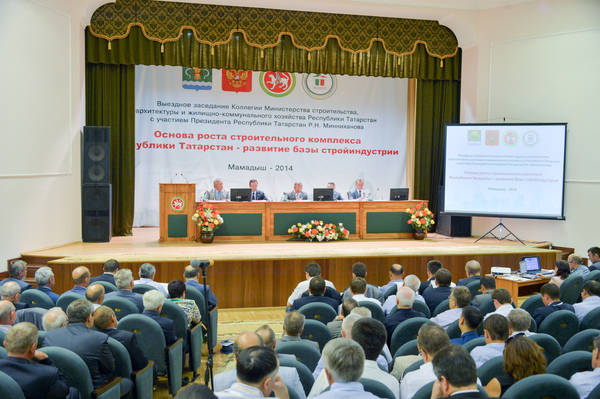 "Татарстан Республикасы төзелеш комплексын үстерү нигезе - төзелеш индустриясе базасын үстерү" темасынаТатарстан Республикасы төзелеш, архитектура һәм торак-коммуналь хуҗалык министрлыгы коллегиясенең күчмә утырышы һәм "Төзүчеләр көненә" багышланган тантана. Татарстан Республикасы Президенты Р.Н. Миңнеханов катнаша. 06.08.2014