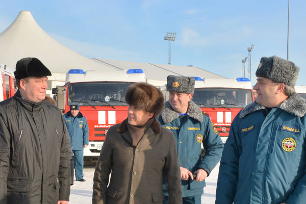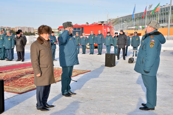 Россия Федерациясе Гадәттән тыш хәлләр министрлыгының Татарстан Республикасы буенча баш идарәсенә һәм Татарстан Республикасы Сәламәтлек саклау министрлыгына техника тапшыруның тантаналы церемониясе. Татарстан Республикасы Президеенты Р. Н. Миңнеханов һәм РФ Гражданнар оборонасы эшләре, гадәттән тыш хәлләр һәм бәла-каза нәтиҗәләрен бетерү мәсьәләләре буенча министр Владимир Андреевич Пучков катнашалар. 12.02.2013