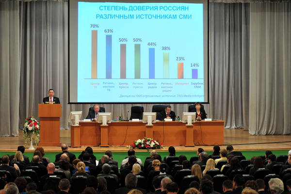 "Татмедиа" агентлыгы коллегиясенең 2011 ел нәтиҗәләре һәм 2012 елга максатлар буенча киңәйтелгән утырышы. ТР Президенты Р.Н.Миңнеханов катнаша. Ринат Сафин фотосы.