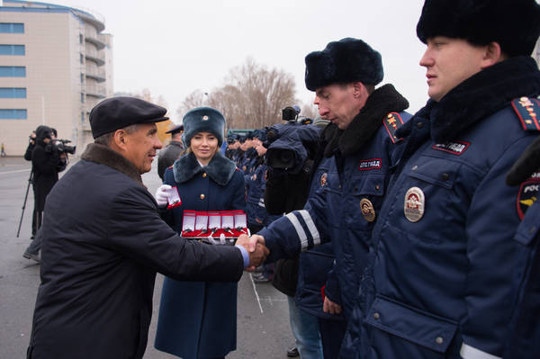 ЮХИДИ бүлекчәләренә, Россия Эчке эшләр министрлыгының Татарстан Республикасы буенча идарәләренең, бүлекләренең (бүлекчәләренең) дежур частенә хезмәт автотранспорты бүләк итү тантанасы. Татарстан Республикасы Президенты Р.Н. Миңнеханов катнаша. 05.11.2015
