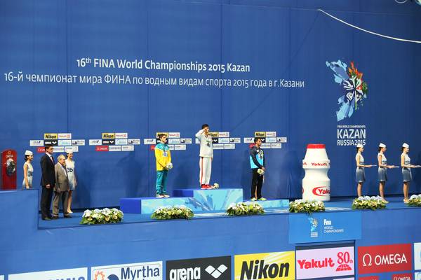 Су спорт төрләре буенча 16нчы дөнья чемпионаты. Татарстан Республикасы Дәүләт Киңәшчесе М.Ш.Шәймиевның йөзү ярышларында җиңүчеләрне бүләкләү тантанасында катнашуы 06.08.2015