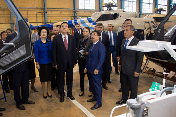 Бөтенкытай халык вәкилләре җыелышының Даими комитеты Рәисе Чжан Дэцзян җитәкчелегендәге Кытай Халык Республикасы делегациясе Казан вертолетлар заводында булуы. Татарстан Республикасы Президенты вазыйфаларын вакытлыча башкаручы Рөстәм Миңнеханов озата йөри. 10.06.2015