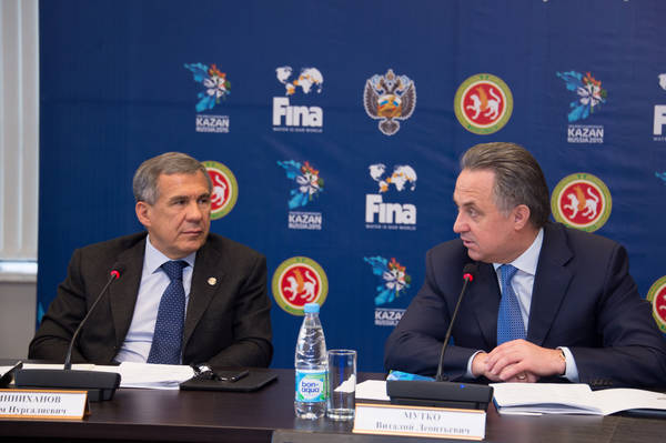 Су спорт төрләре буенча XVI дөнья чемпионатына әзерлек һәм аны уздыру буенча оештыру комитеты утырышы. Россия Федерациясе Спорт министры Виталий Леонтьевич Мутко уздыра. Татарстан Республикасы Президенты вазыйфаларын вакытлыча башкаручы Р.Н. Миңнеханов катнаша. 24.04.2015